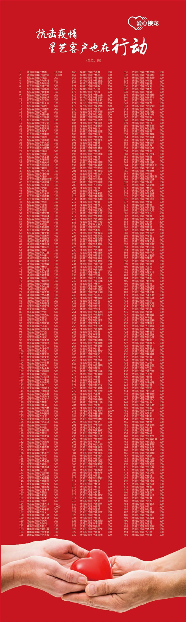 從星藝裝飾“愛心接龍”開啟以來,星藝全國眾多單位積極捐款,星藝員工自愿捐款,甚至星藝客戶也通過“愛心接龍”捐款……同心抗疫,星藝在行動,凝聚起抗擊疫情的強大力量!