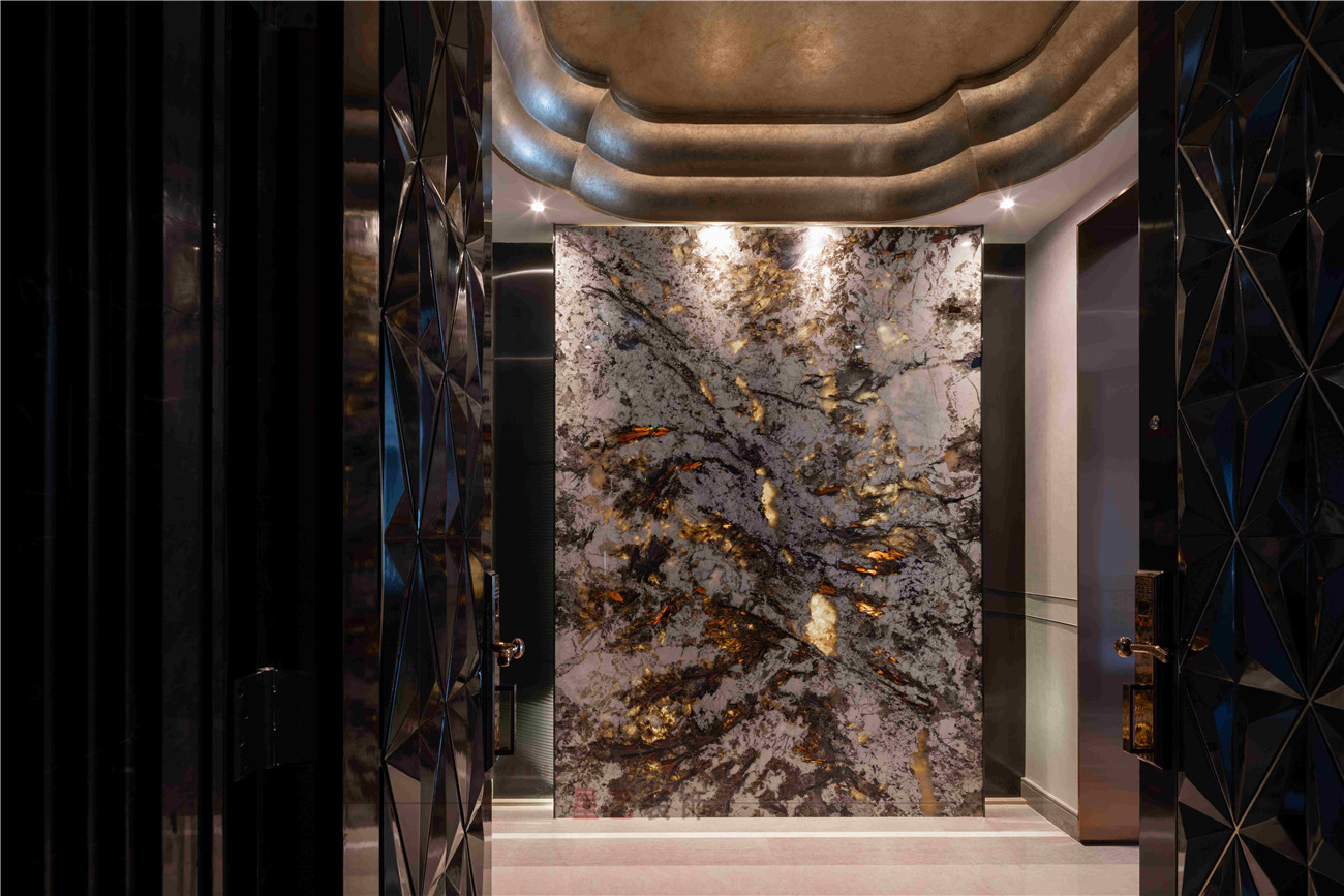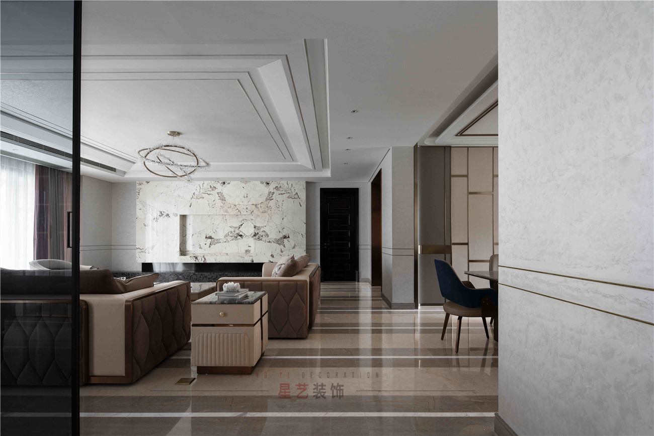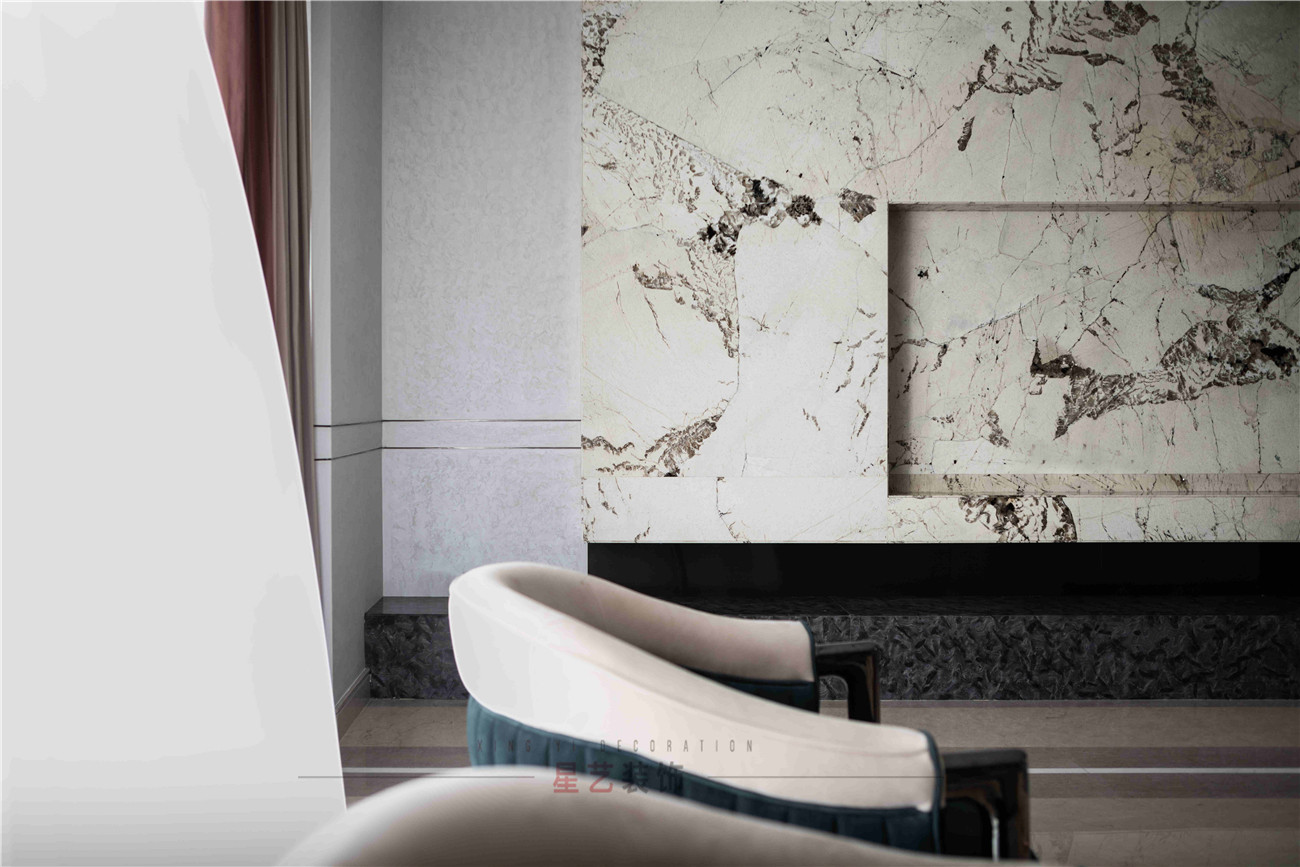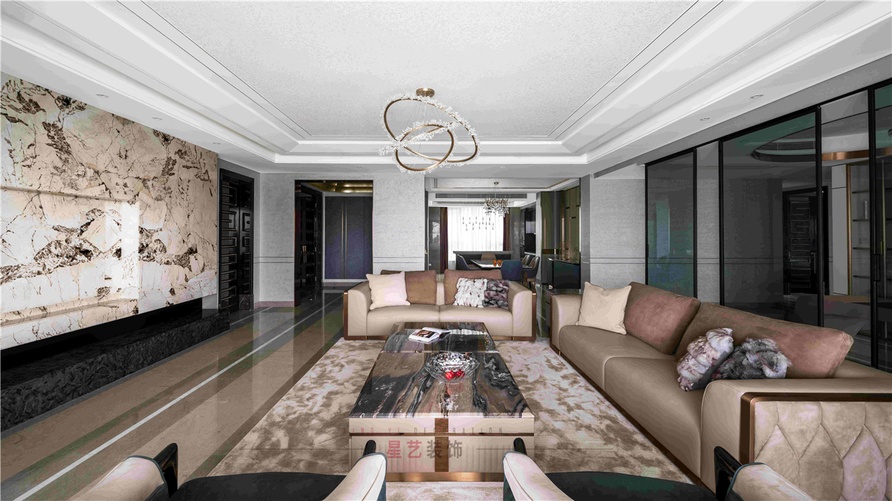 本案設計是位于海珠區380㎡的住宅,擁有無敵景觀一視野,業主90后,準備做婚房,要求輕奢,鐘愛石材,金屬和皮質的家居風格,敞開式書房通過隔斷可移動屏風于客戶區域串聯起來,可開可隔斷的靈動組合,最大的強化空間包容及開闊性,用中西結合的方式為即將到來的婚姻生活帶來更高的幸福指數,打造溫馨的生活環境。