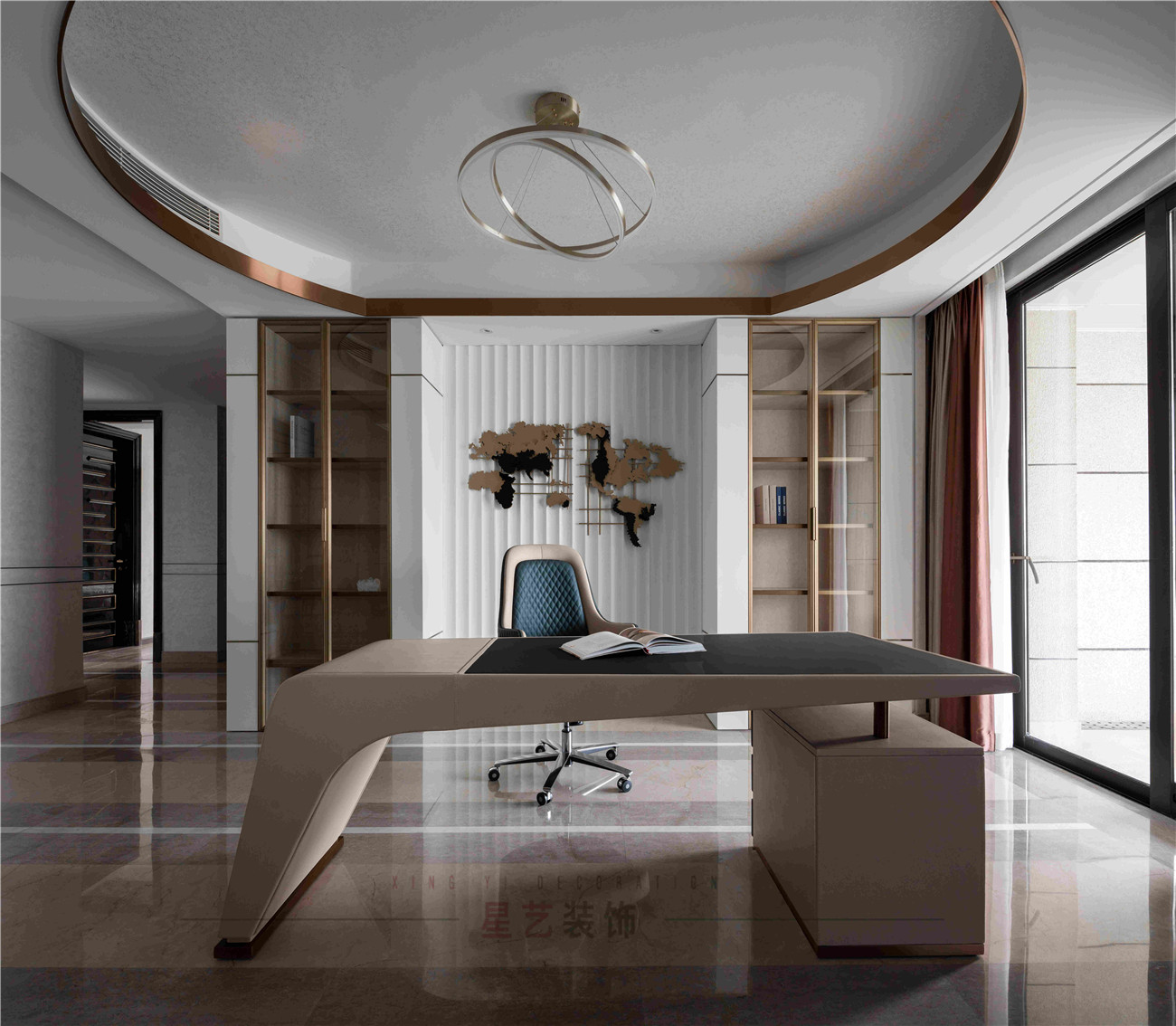 想要過上向往的生活,工作就顯得總是無處不在,辦公區是在家中辦公或者看書的地方。這樣充滿的科技感的辦公桌就備受年輕人的喜愛,尤其是跟客廳相呼應的圓形吊燈和棕色邊框的修飾,直接把整體的時尚度拉滿,同時寬闊獨立的空間更是減緩了工作壓力帶來的壓迫感。