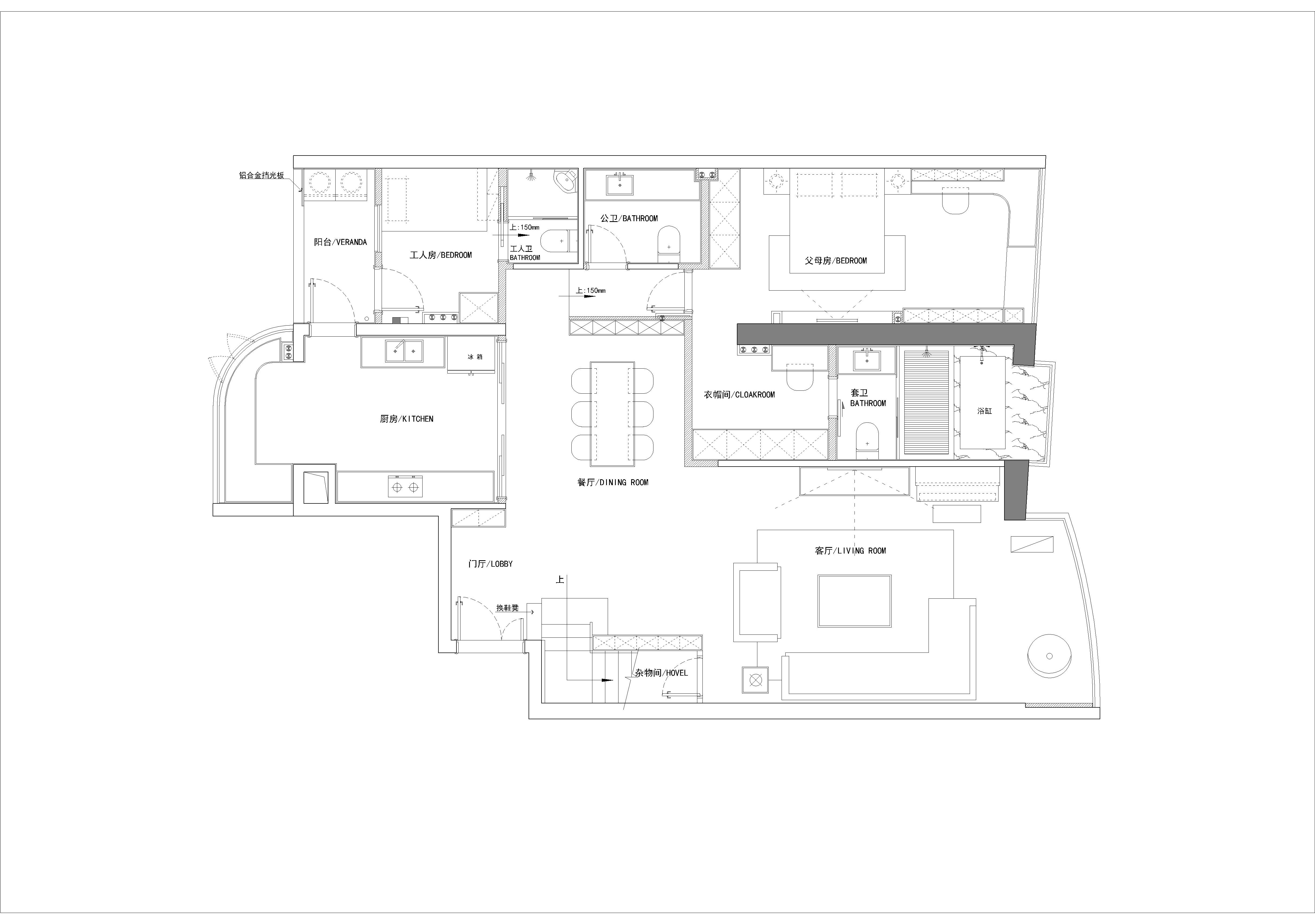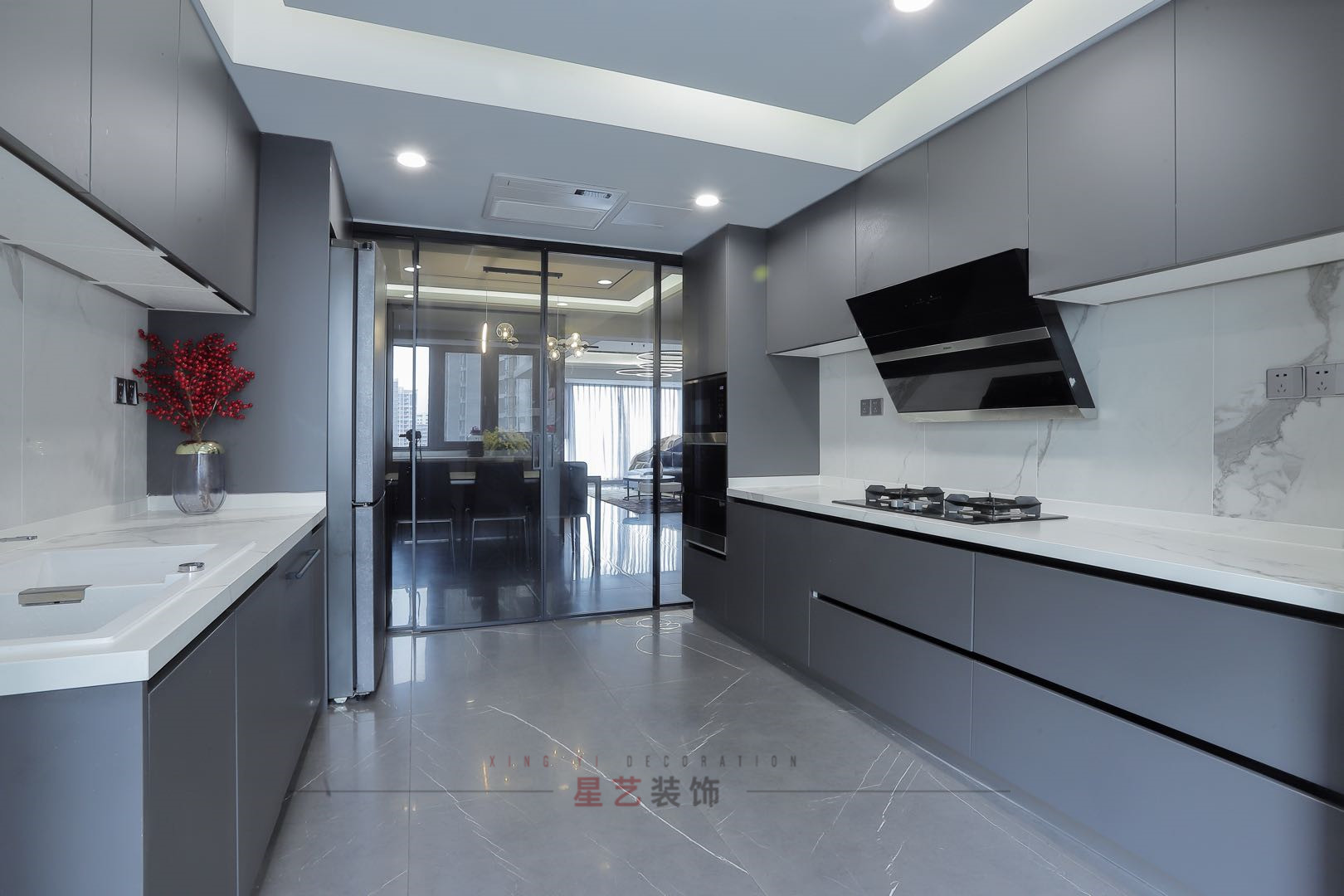 廚房部分是最能體現空間感的地方,白色的大理石臺面搭配灰色的收納櫥柜,簡約而不失高級感,透明的移動玻璃門和黑邊的修飾都很好的協調了大面積灰色帶來的沉悶感。