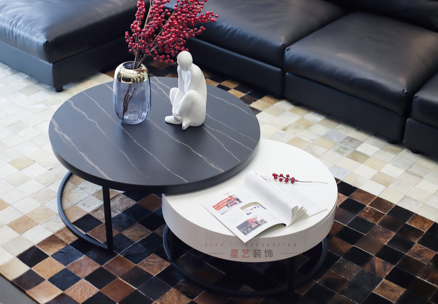 客廳首先就給人一種清幽的意境,黑色的皮質沙發,搭配上拼接的黑白圓桌和深褐色的格子地毯,吊燈也沒有用復雜的水晶燈,而是是簡約又設計感的圓管白燈,合理的空間分配平衡了厚重天花板帶來的壓迫感,把黑白灰的高級感發揮到了極致。