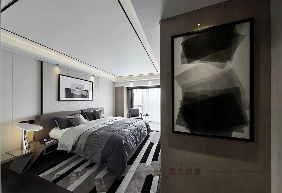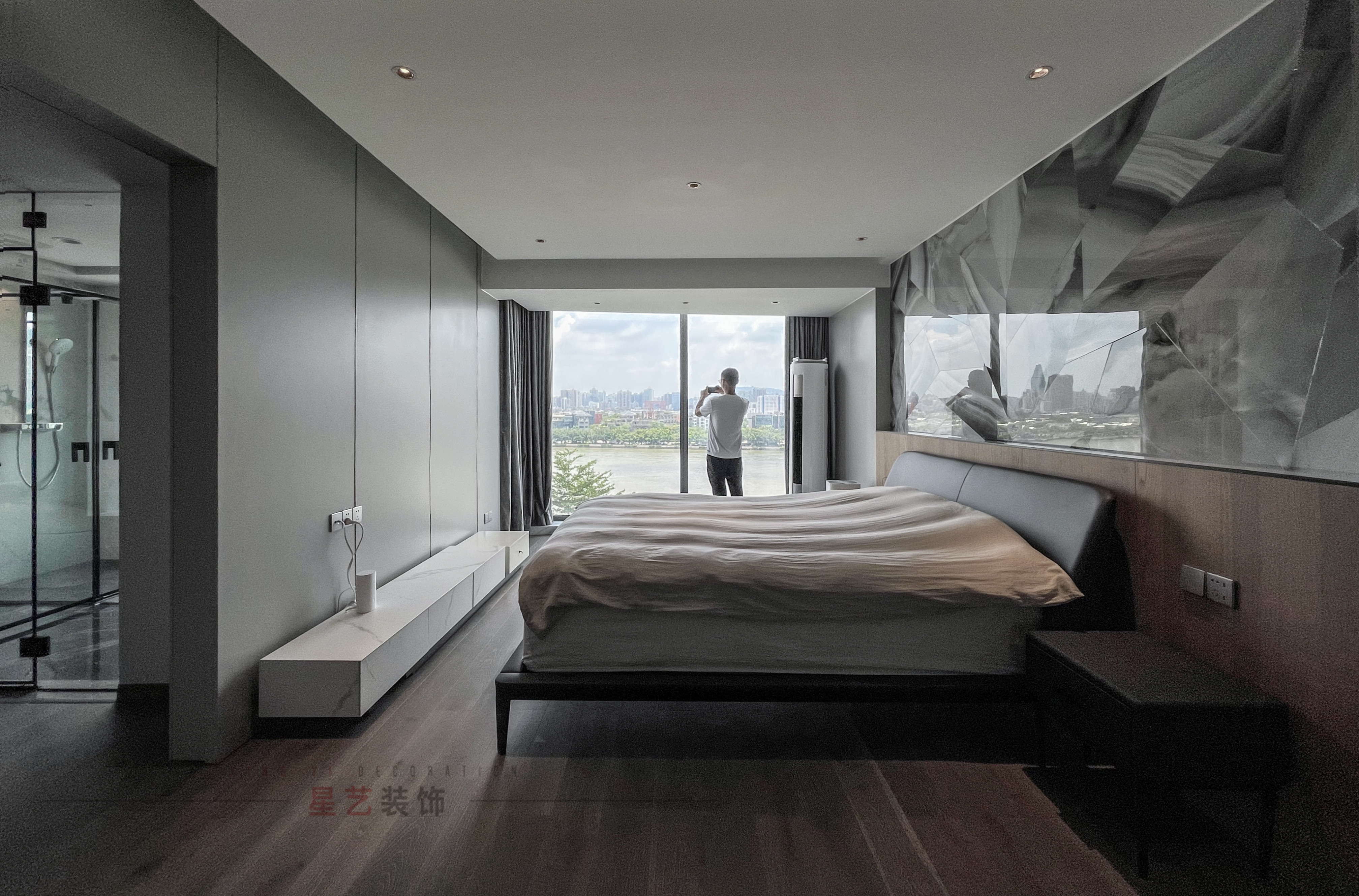 主臥主要打造一種平和靜謐獨立空間,利用極佳的地理優勢,在站在落地窗前每天都能看到不一樣的珠江風景,視野開闊。床頭上坊還有玻璃碎片拼圖,不需要太多的裝飾,房間也不會顯得空落落的。