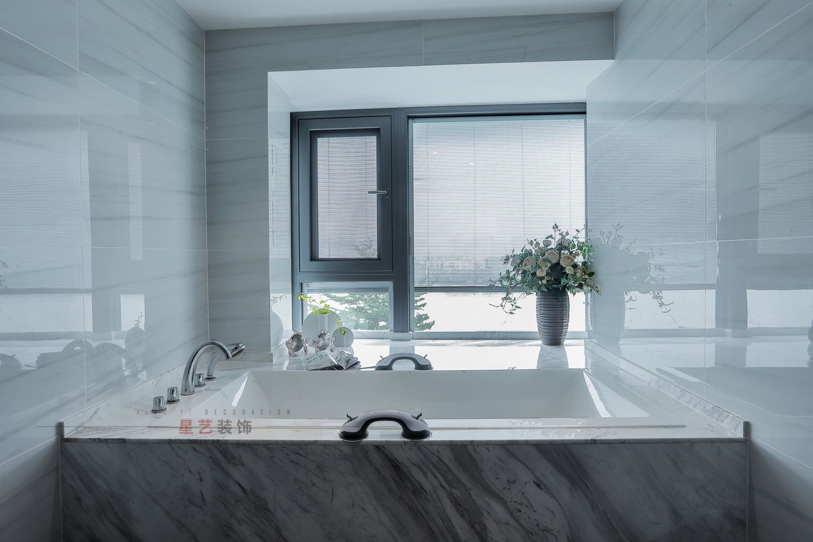 另外單獨設計了浴缸,同樣是黑白搭配,但是兩邊用白色瓷磚讓整體空間都拉大了,窗邊放上一束花,下班回家舒舒服服得泡個熱水澡,這就是簡單的幸福吧。