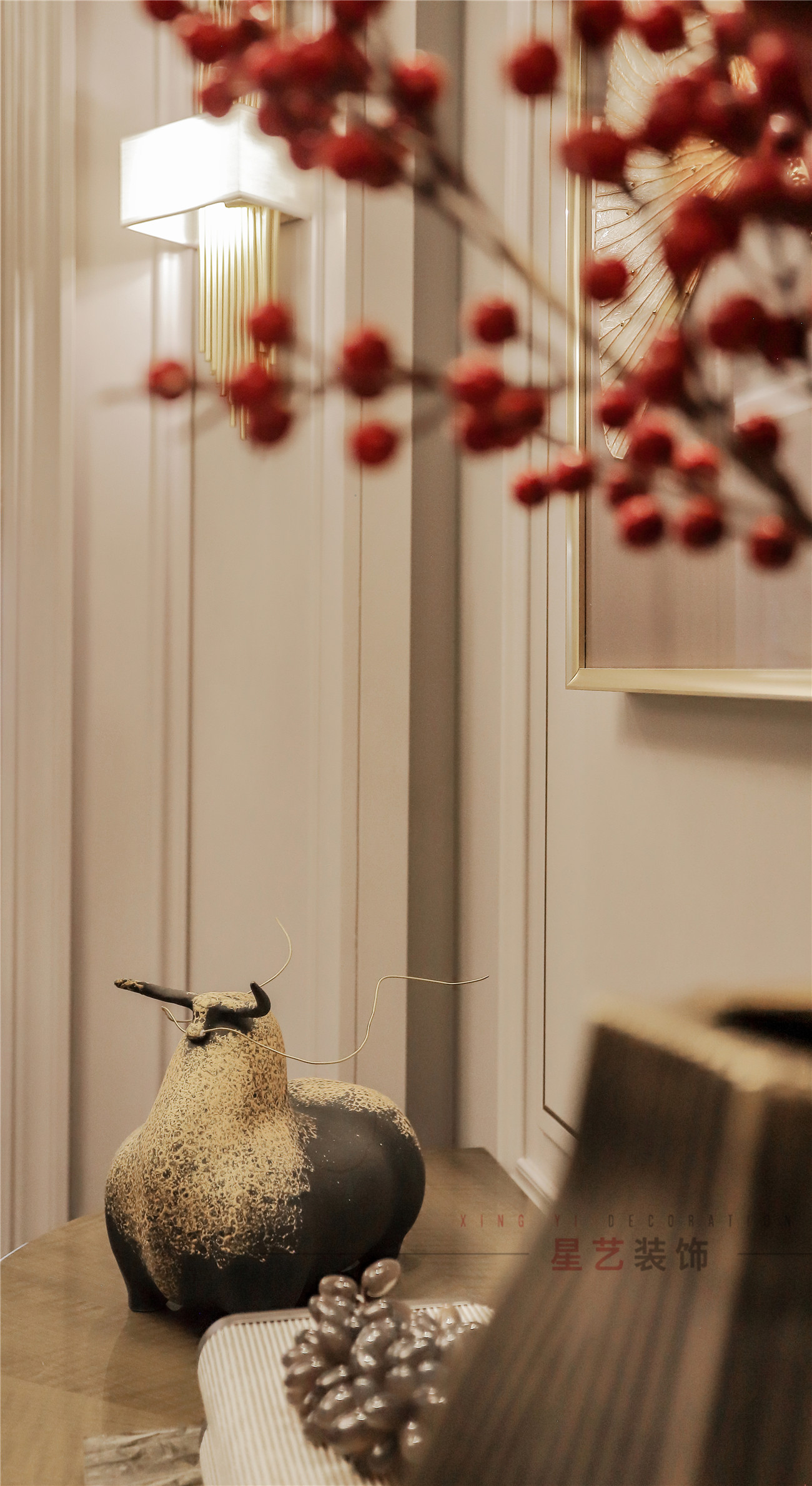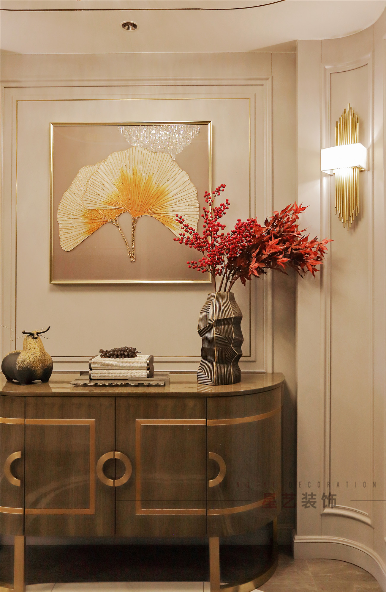 而實景中卻讓人眼前一亮,打開門的一瞬間好像回到了落葉繽紛的秋季,紅豆代表思念,楓葉是回憶和堅忍的象征,銀杏則代表永恒的愛,陶瓷擺件和不規則花瓶也是設計師別出心裁的部分,提升了整體設計的文藝氣息。