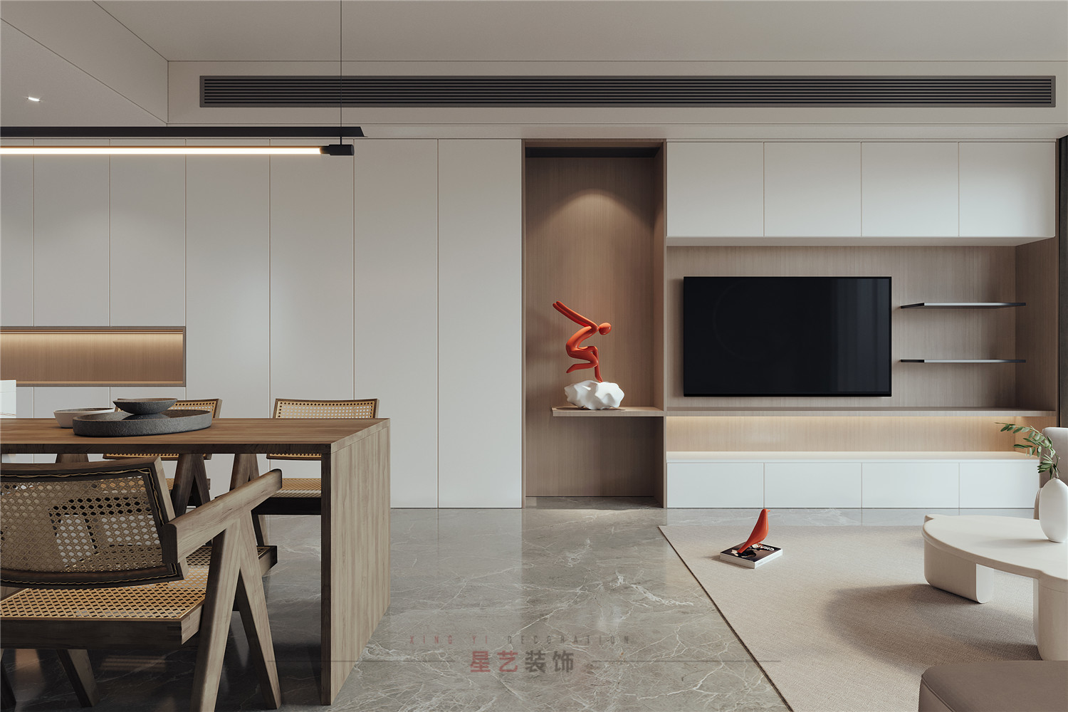 從客廳的角度可以看到極具設計感得端景,用對稱的手法把背景墻一分為二,關燈的時候可能只覺得比較特別,但開燈后,橘紅色的小人在昏暗燈光的映襯下卻營造出了藝術感和視覺美感。