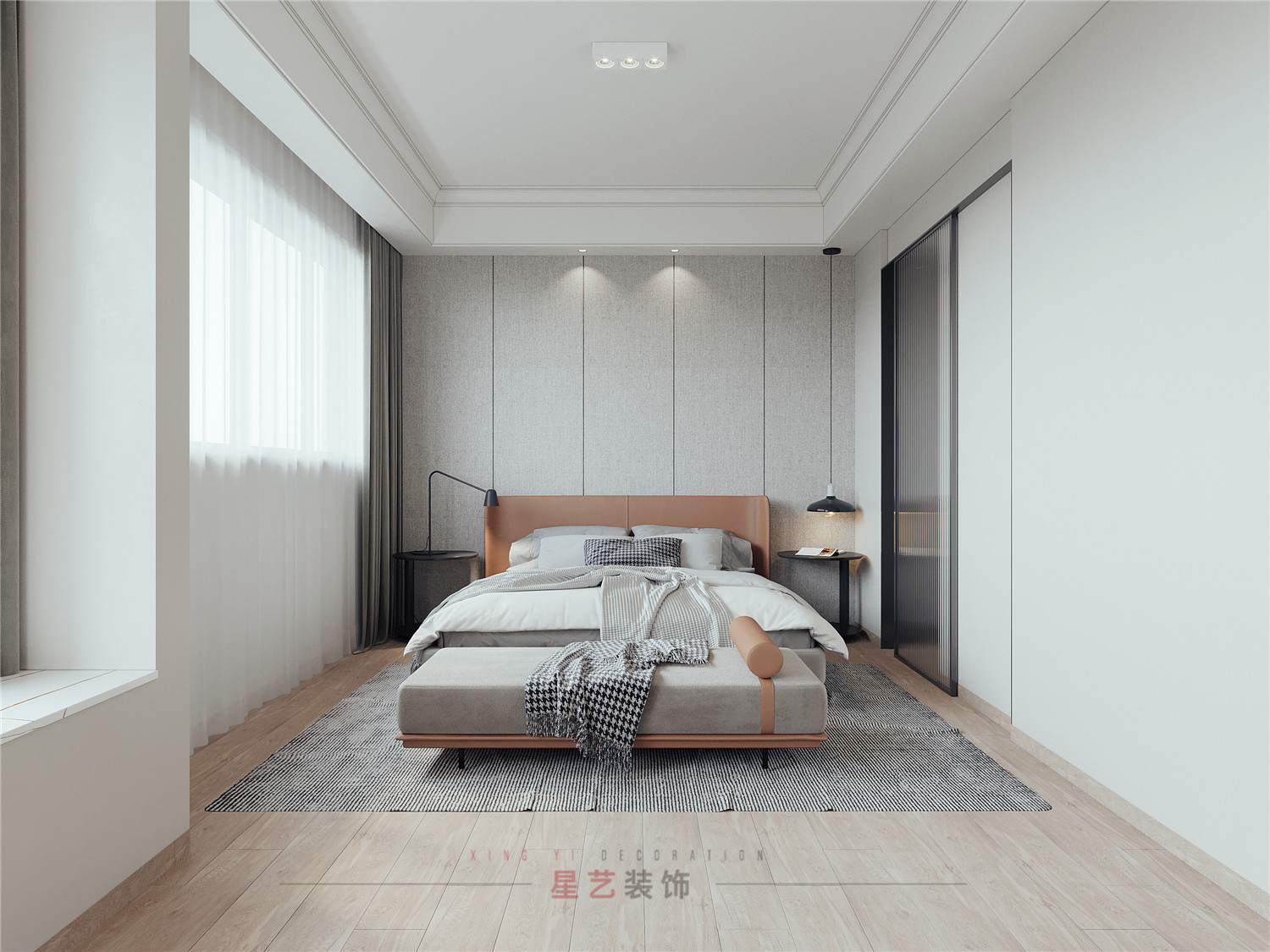 臥室里設有衣帽間,工作與生活都在客廳,所以臥室放床尾凳也是巧妙的擴大了臥室的剩余空間,不會顯得累贅還是一個多功能區域。