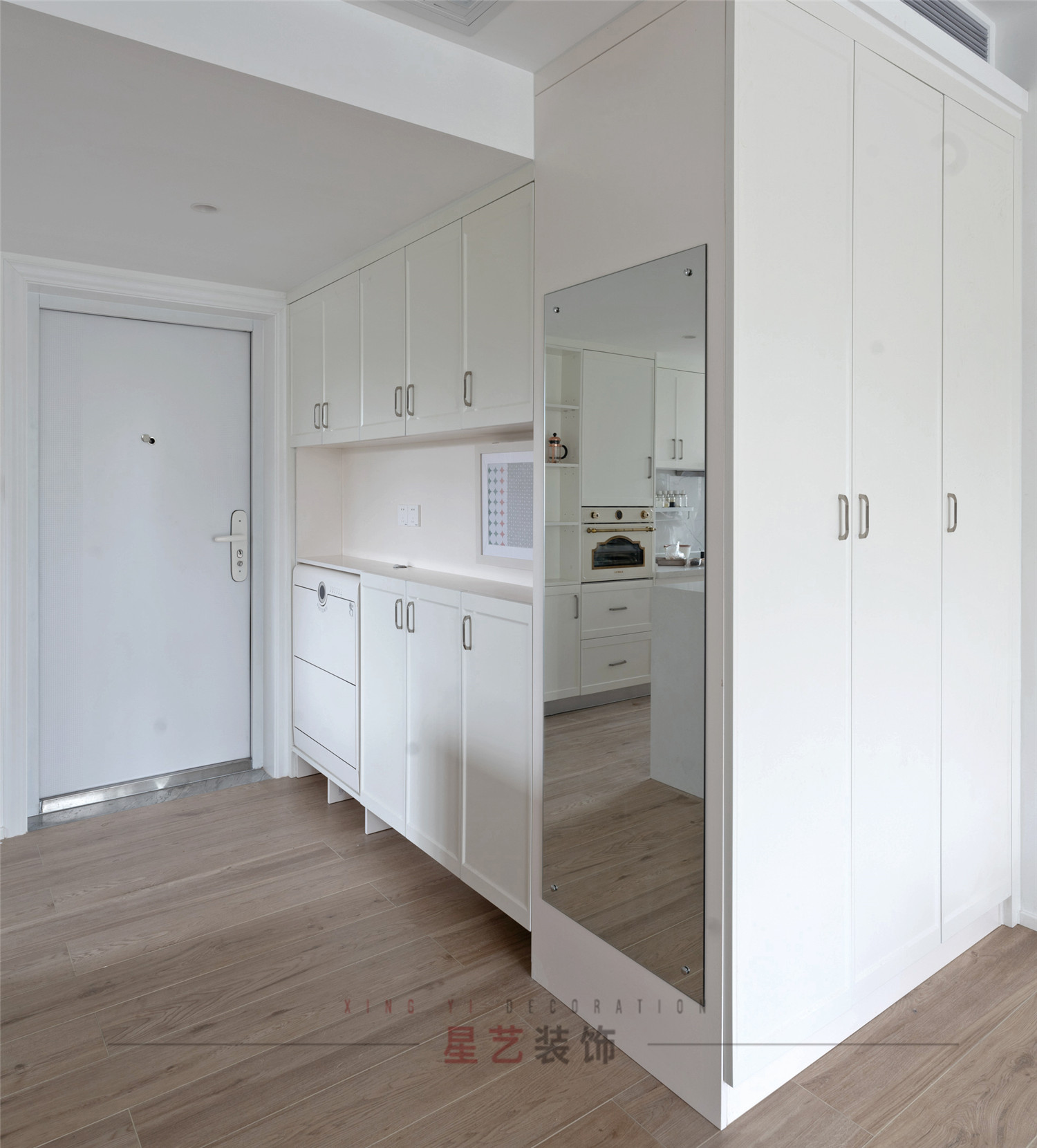 玄關(guān)雖然占地面積小,卻是每天的必經(jīng)之地,超大的容量的儲物柜具有強大的功能性與實用性,底部留空的設(shè)計方便打掃又能放日常更換的鞋子,干凈整潔。