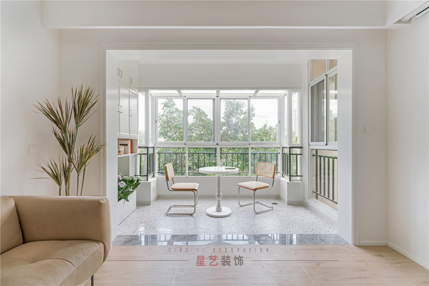 陽臺連接客廳拓展空間,原木色與綠植的結(jié)合打造出自然系的家居生活,感受獨處的愜意。