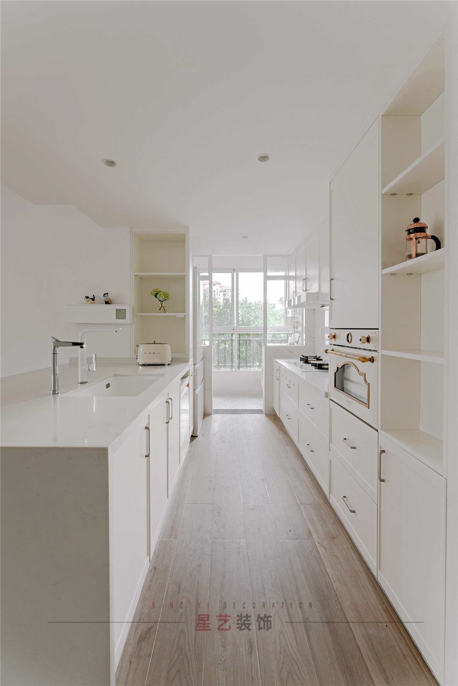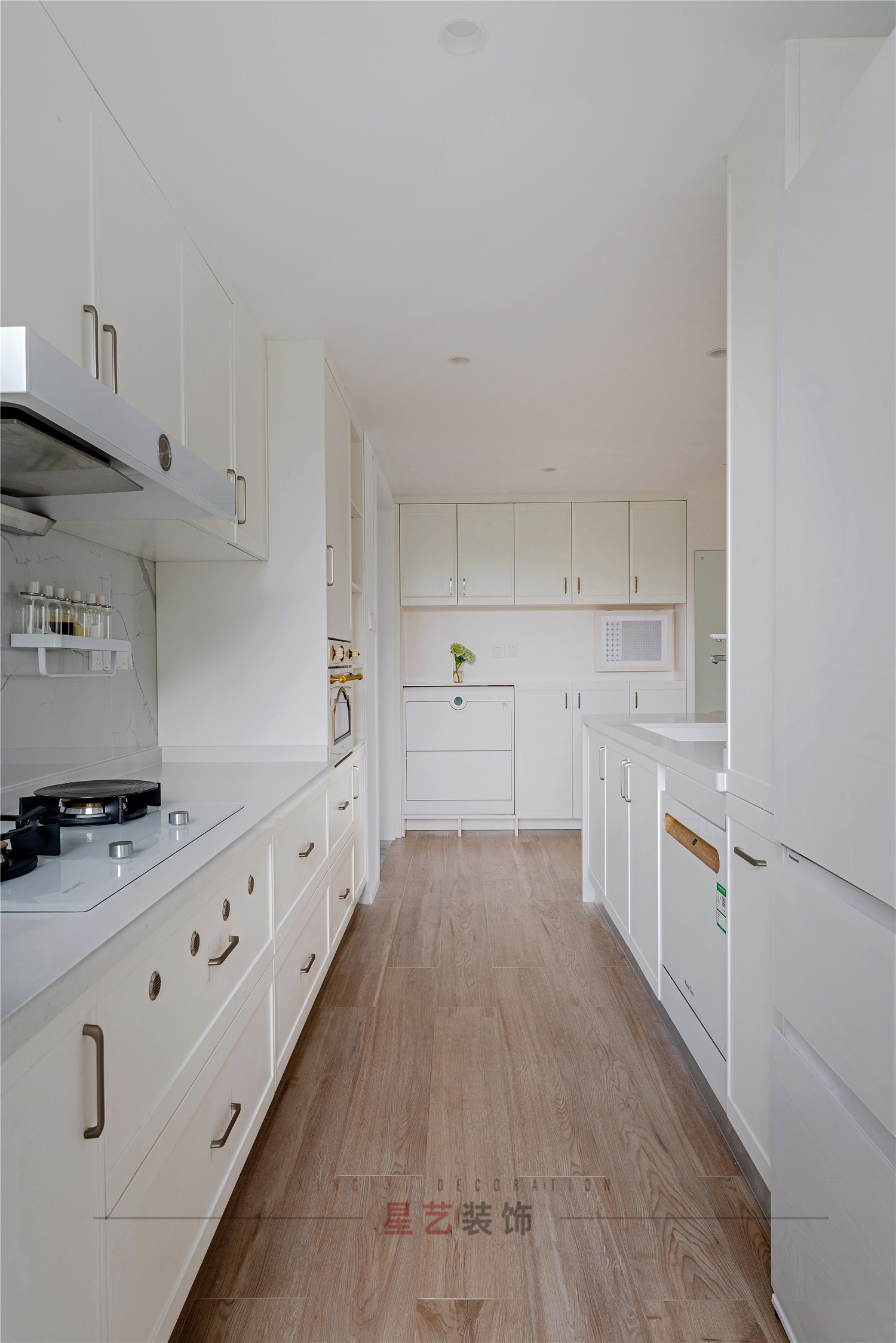 選擇開放式的廚房,植入一個超大導臺讓整個空間更加寬敞,多人使用都不會感覺太擁擠,體驗感極佳。日常一邊做菜的同時也可以跟家人交流,與最親密的人享受柴米油鹽帶來的樂趣。