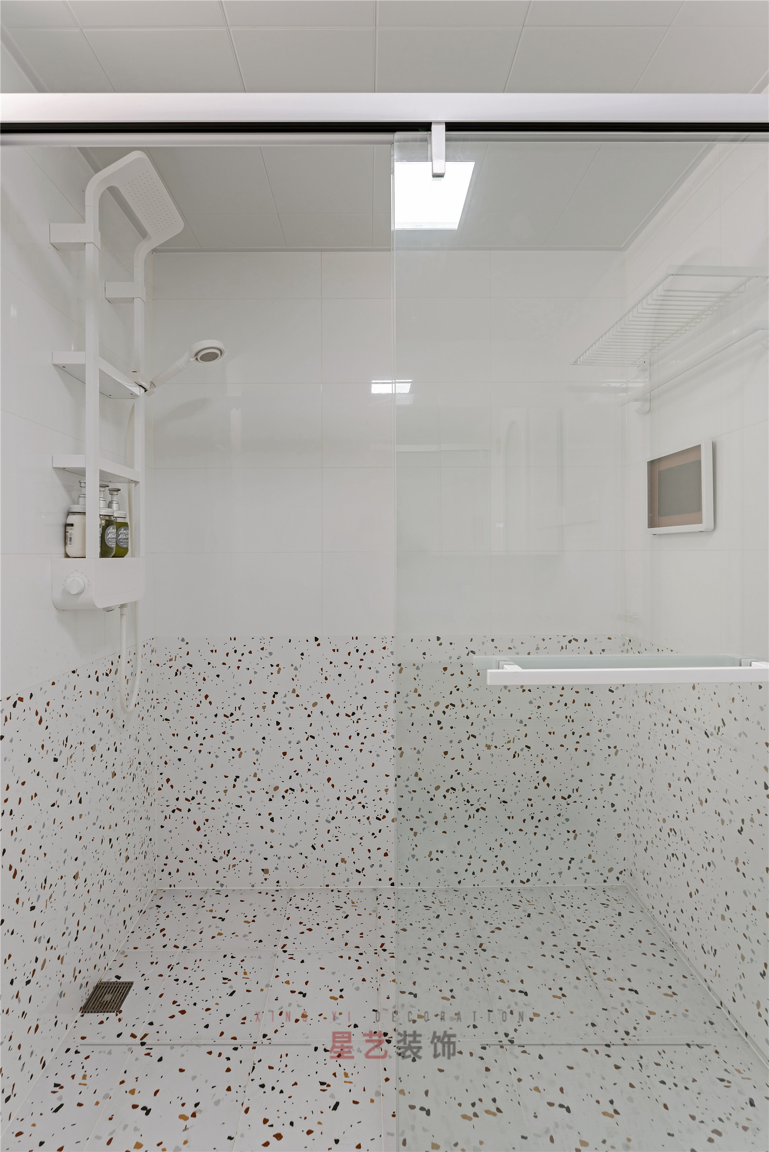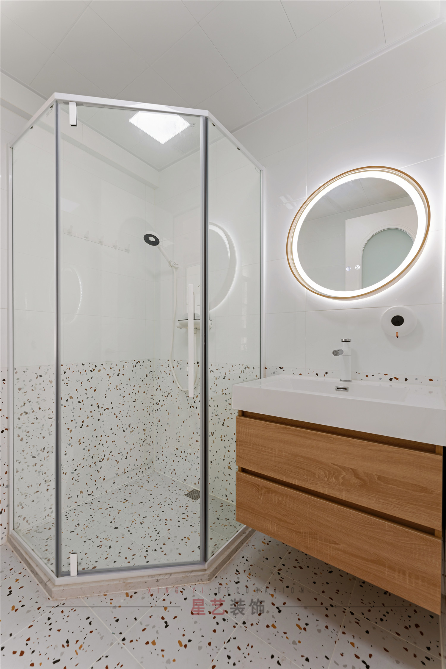 簡約卻不簡單的淋浴房一半都用彩色斑點瓷磚做鋪墊,與干濕分離的梯形區(qū)域和圓形的發(fā)光境結(jié)合,呈現(xiàn)出干凈有格調(diào)的輕奢感。