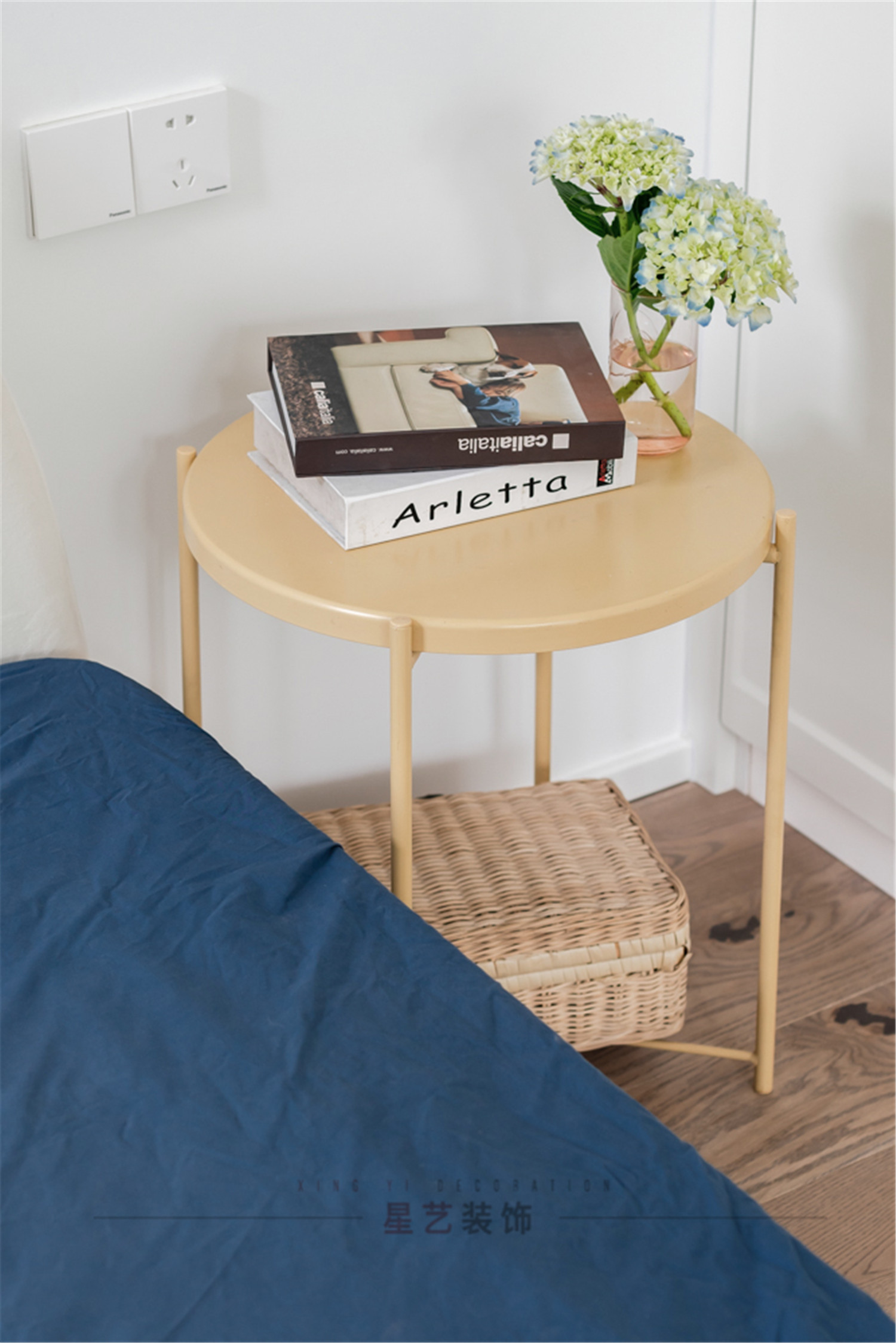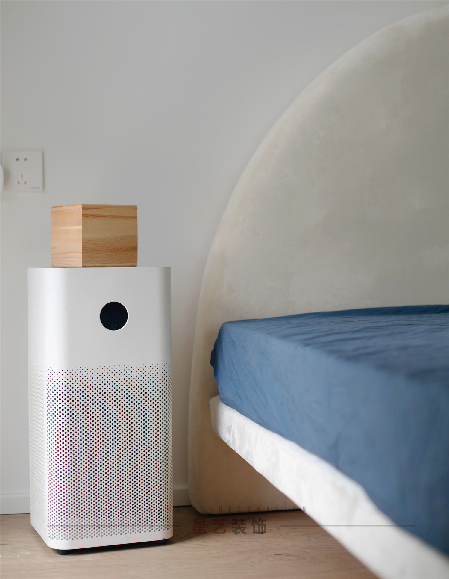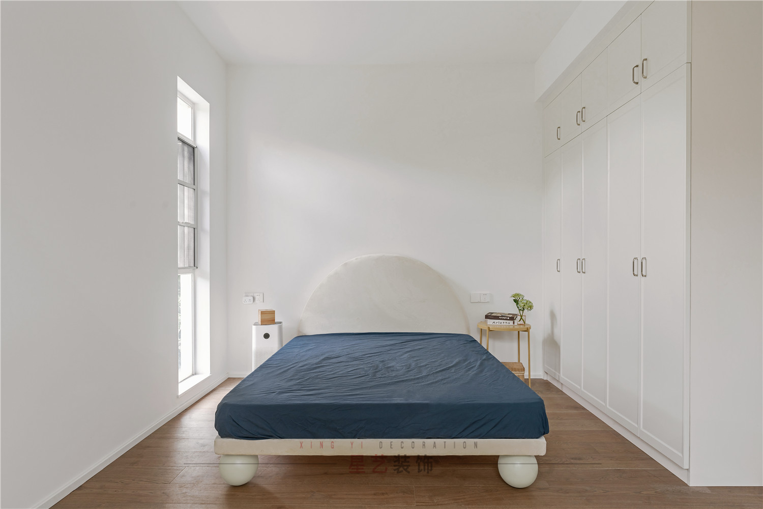 臥室在床頭的位置設(shè)計了小面積的落地窗,打破整體白色帶來的空曠感,增加層次關(guān)系。半圓形靠背搭配藍色床墊,仿佛置身于海上明月的光景中,給人帶來無限遐想