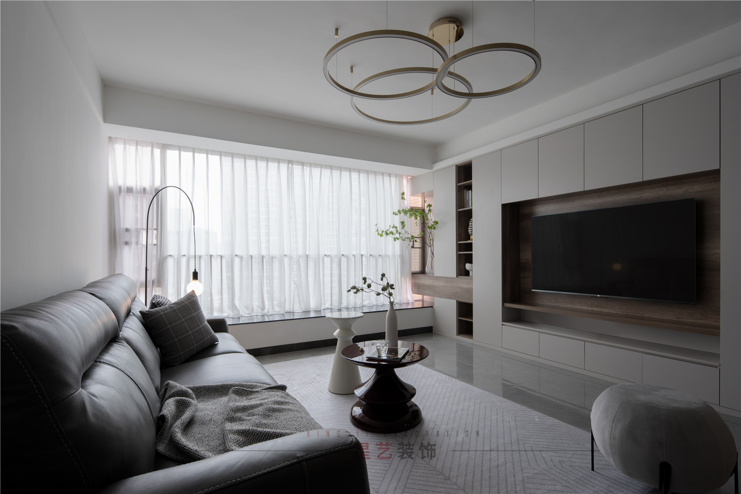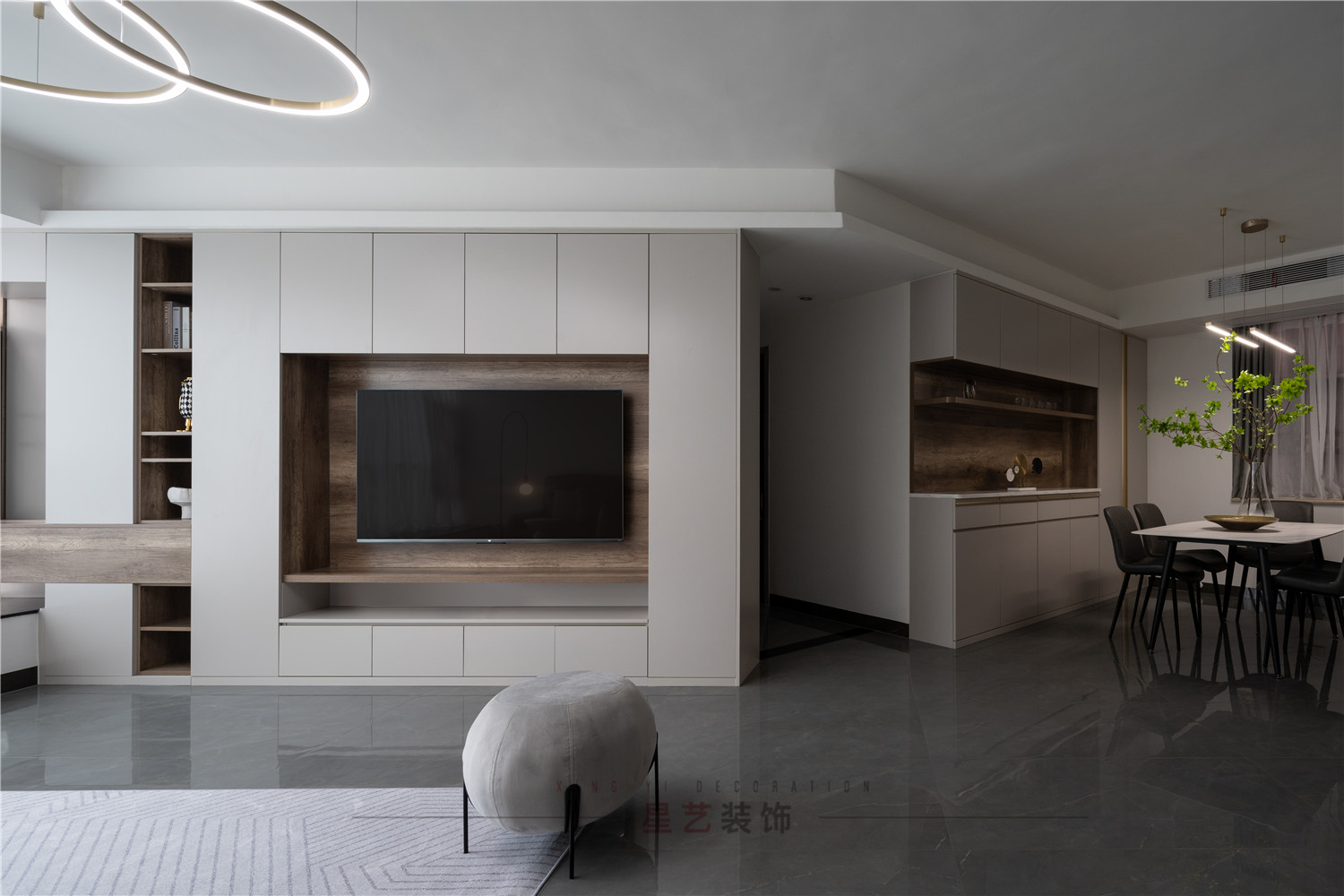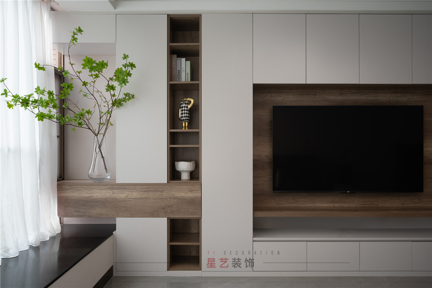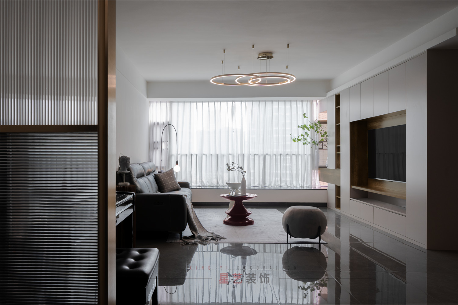 走進(jìn)大門,迎面的光線穿過屏風(fēng)給人一絲絲的柔和和神秘,客廳背景設(shè)計(jì)兼顧儲(chǔ)物和整體的空間提升,開放格的選擇尤為重要。