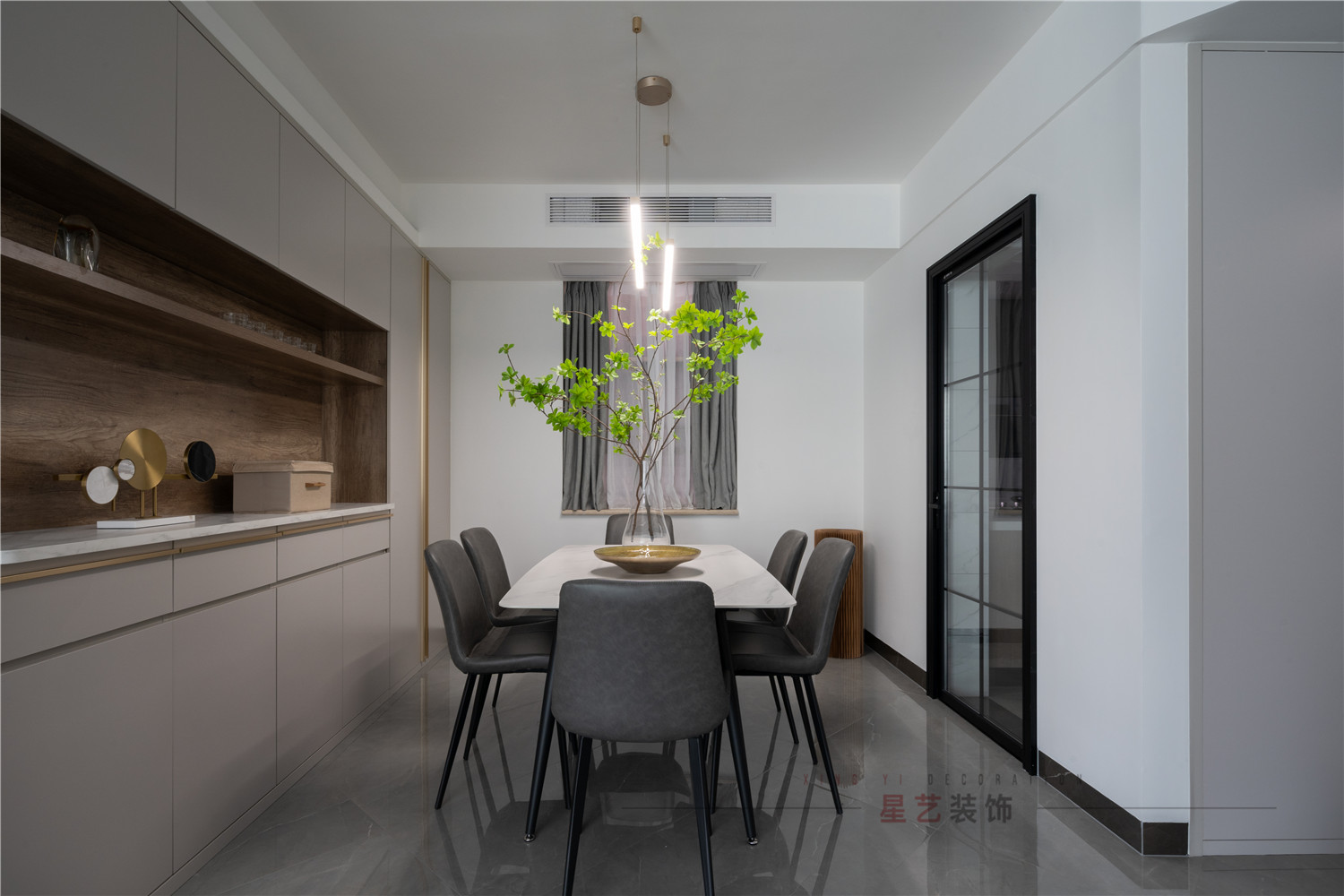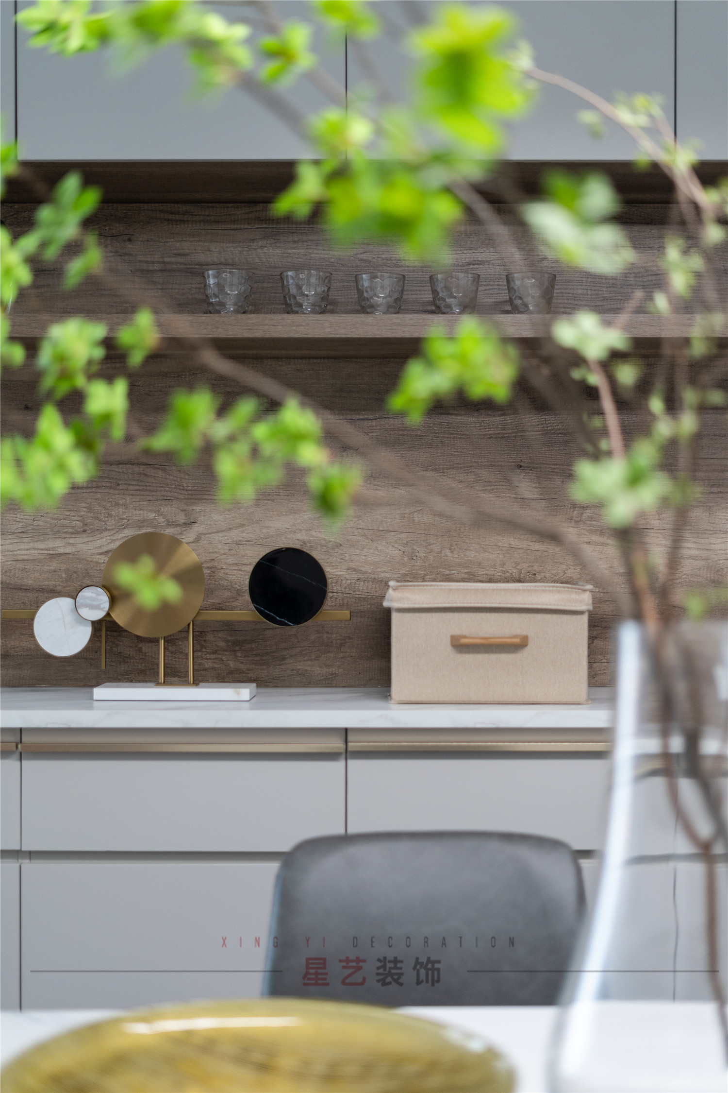 煥然一新的用餐區(qū)簡約清新,整面的置物柜中間設(shè)置置物臺(tái),最常用的東西都方便觸手可得,也可以放喜愛的擺件,整體沒有繁復(fù)的設(shè)計(jì),只有最貼近人間煙火的靜謐氣息。