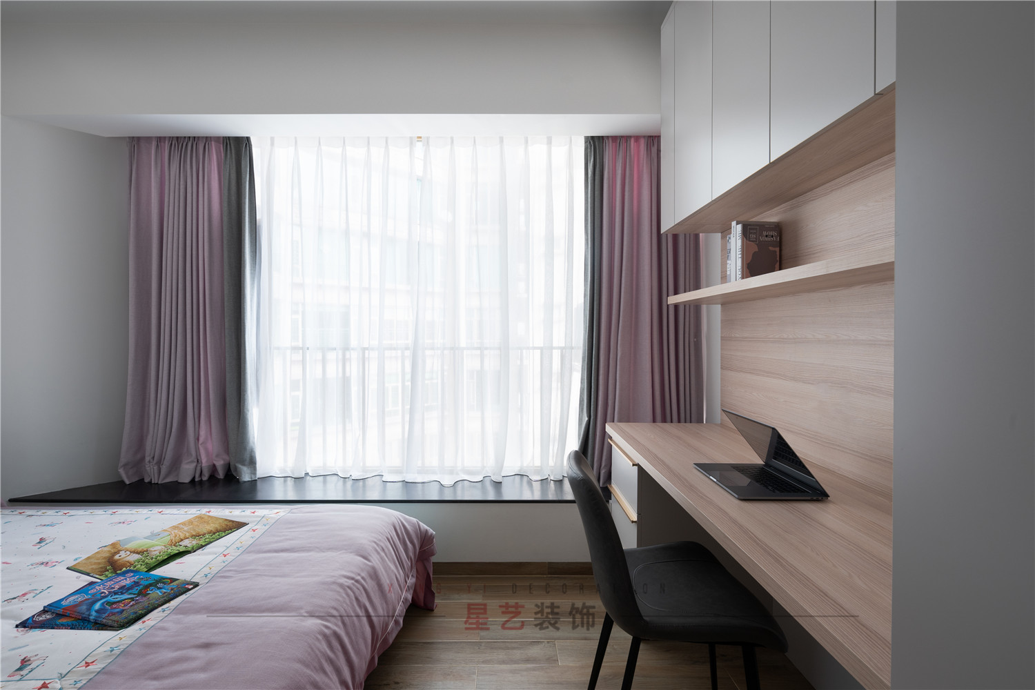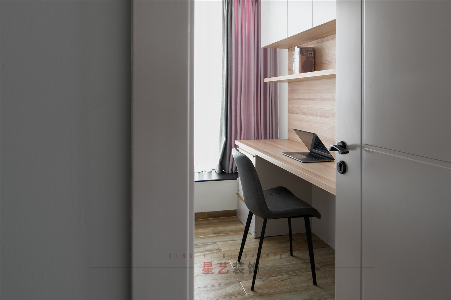由于工作原因,業(yè)主對(duì)房間內(nèi)的最大需求就是大的書桌,在格局上稍微做了調(diào)整。原木書桌會(huì)更加敞亮柔和,有層次感的色彩也能減少工作或者閱讀的疲勞感。體驗(yàn)休憩于家的那份寧靜與愜意。