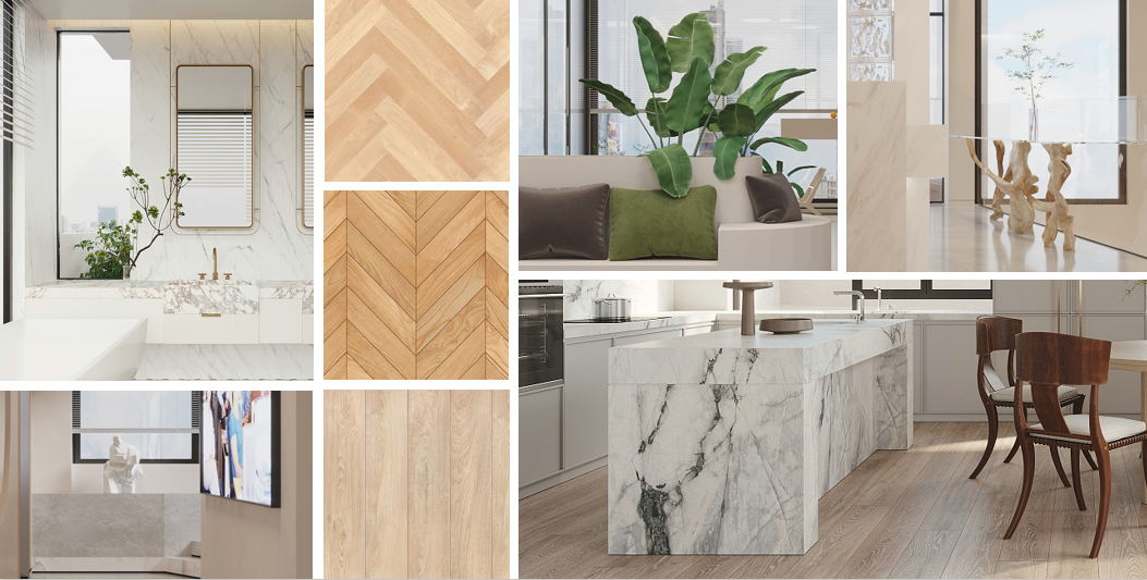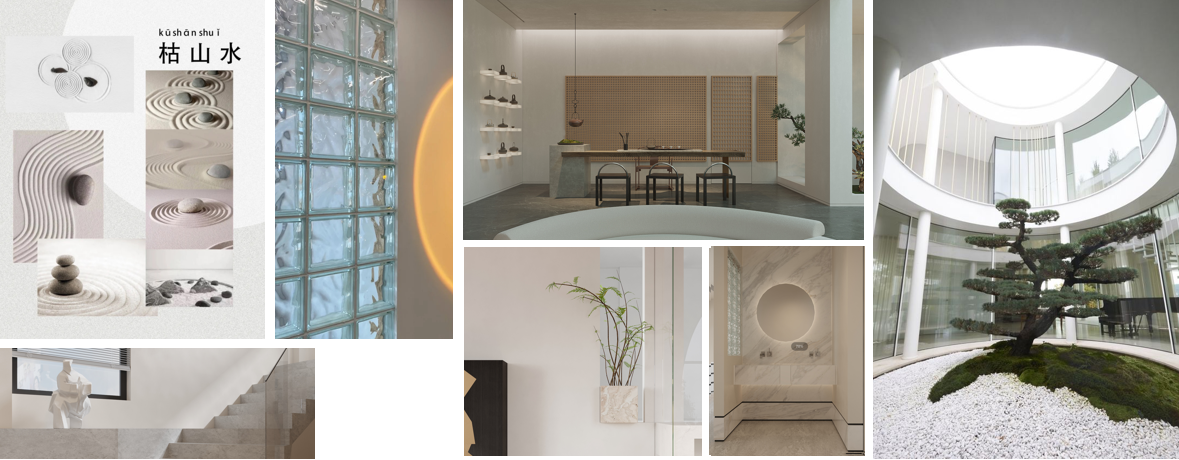 材質及顏色分析:米咖色系,禪意詫寂風、多種木紋材質紋理襯托、大理石原色點綴。
