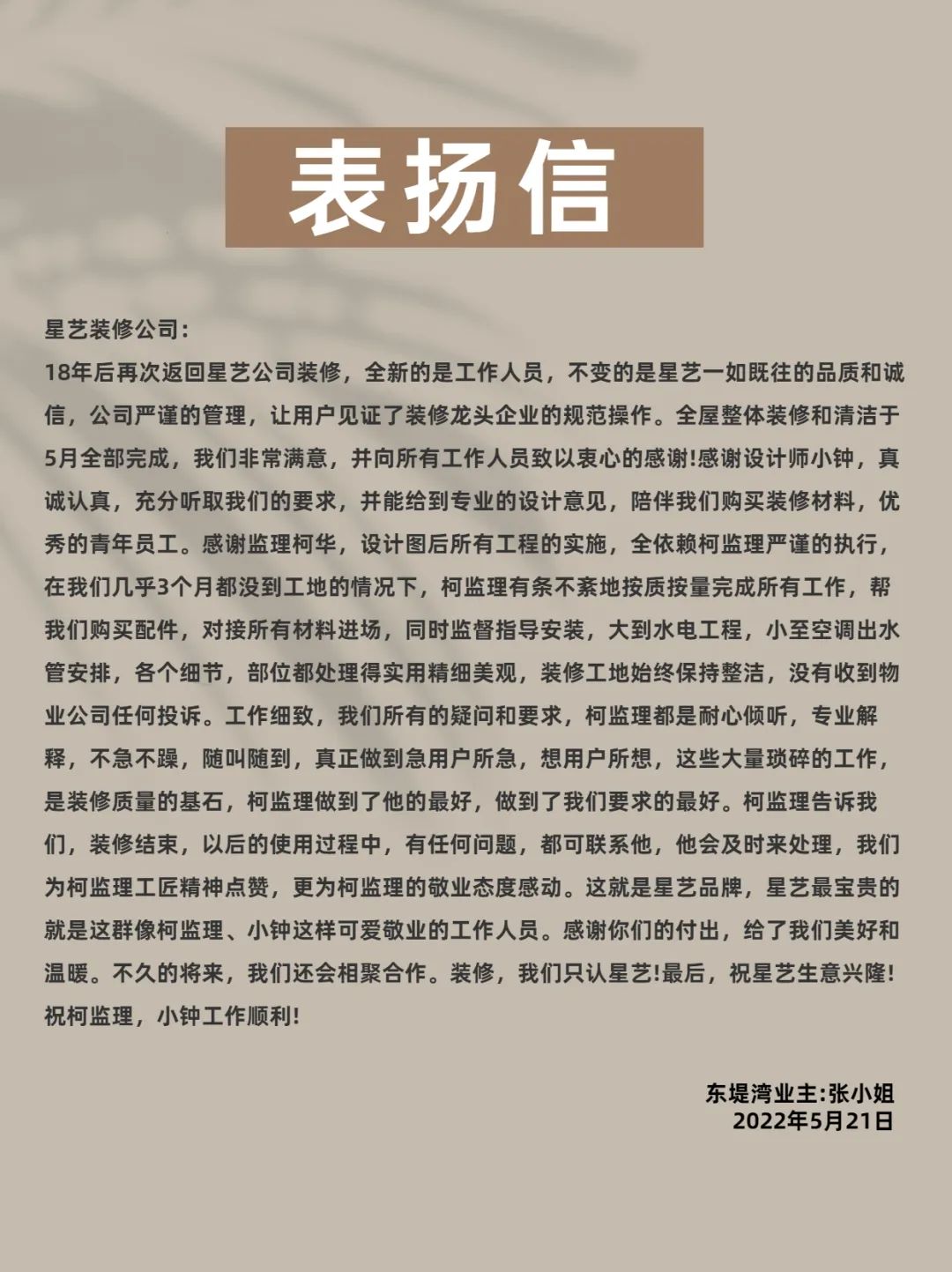 業(yè)主來信|老客戶18年后再次選擇星藝裝飾,來信致以最高褒獎(jiǎng)!