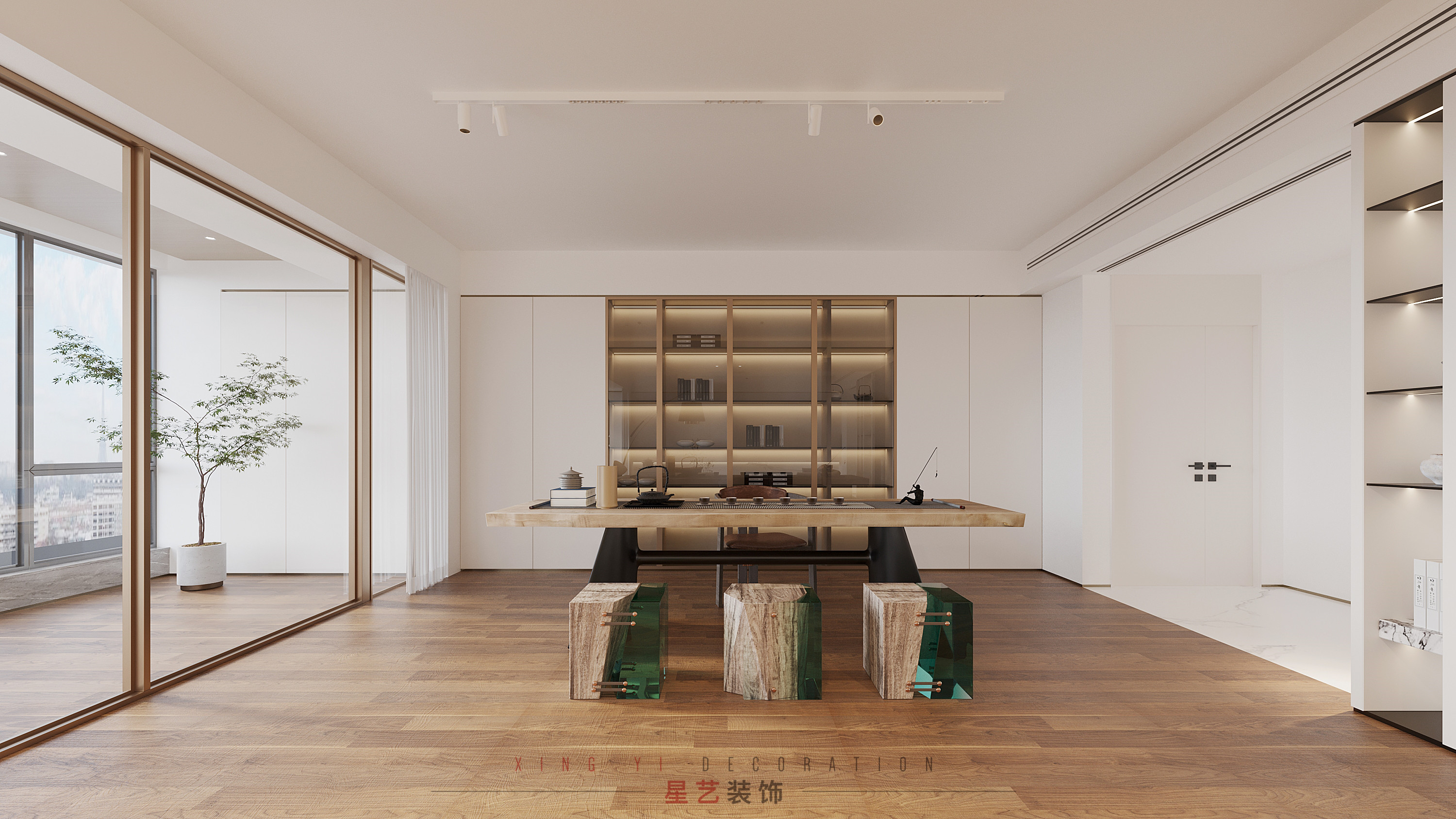 茶室簡潔明了,大面積的玻璃窗讓光線滲入室內(nèi),打開門,風灌進來的時候好像在戶外露營。