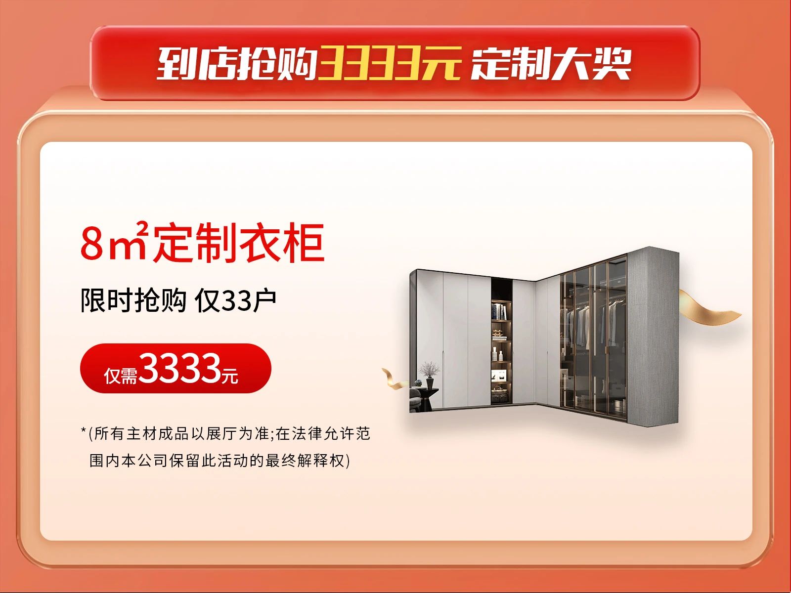 為慶祝星藝33周年活動(dòng),現(xiàn)推出3333元搶購8㎡定制衣柜,限時(shí)限量,有裝修需求的小伙伴抓緊時(shí)間啦!