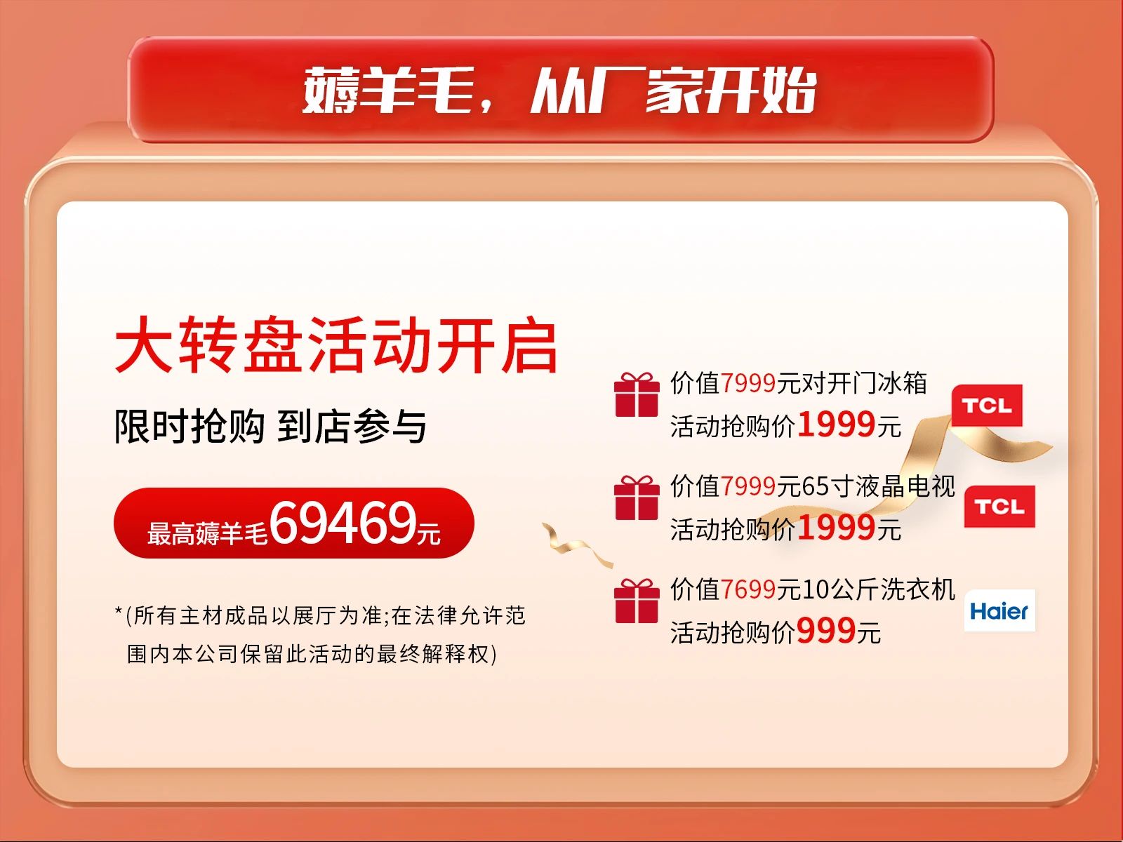 好飾連城活動(dòng)期間,特惠享不停!到店參與大轉(zhuǎn)盤活動(dòng),限時(shí)搶購家電出廠價(jià)!先到先得~